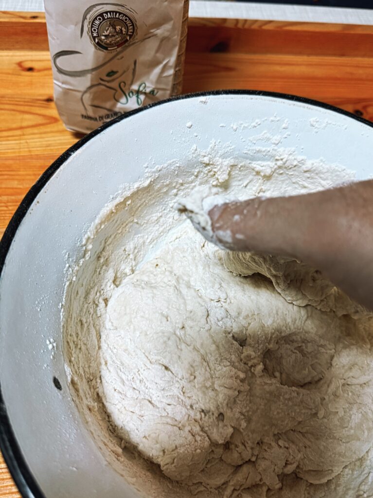 🕒 30 Minuten abgedeckt ruhen lassen, dann einmal dehnen & falten (Stretch & Fold).