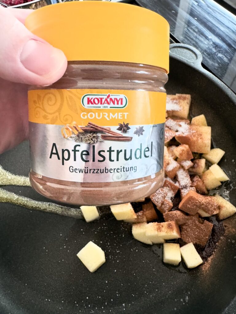 • Apfelwürfel anbraten: In der Pfanne schmelze ich die Butter, füge die Apfelwürfel hinzu und lasse sie in Zucker und Gewürzmischung karamellisieren.