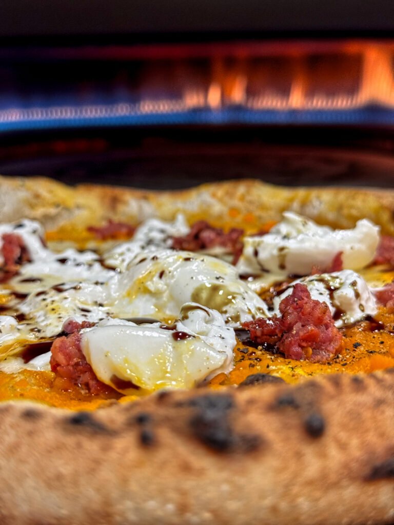 • Mit Fior di Latte und Salsiccia belegen und im Pizzaofen bei entsprechender Hitze goldbraun backen.