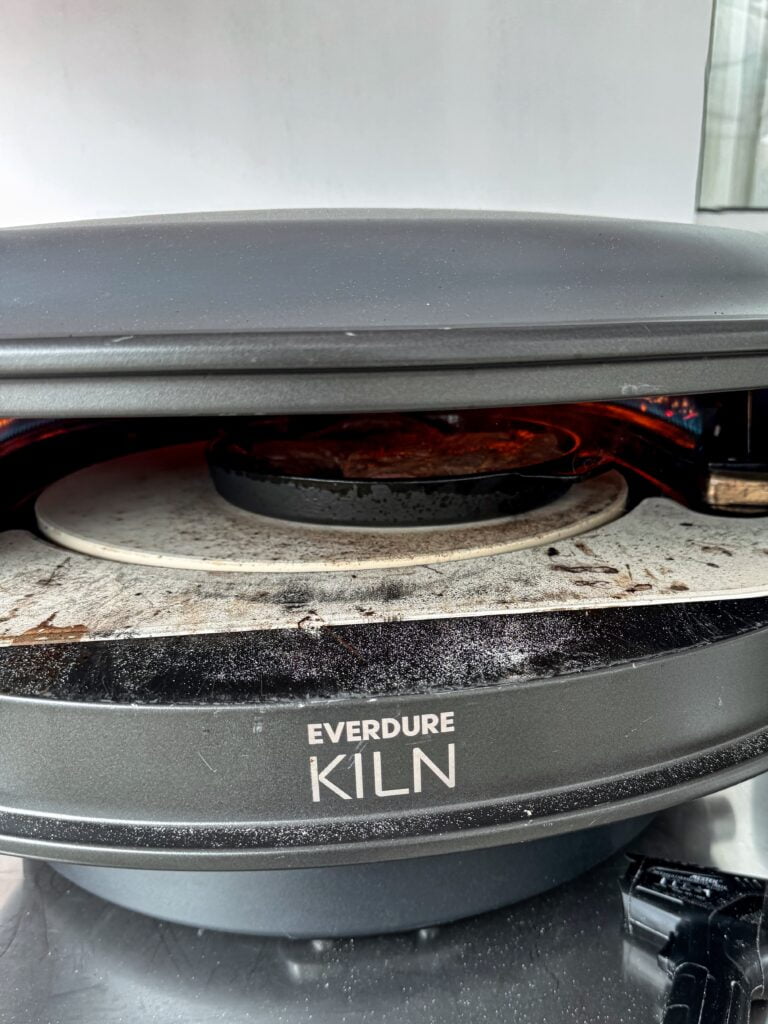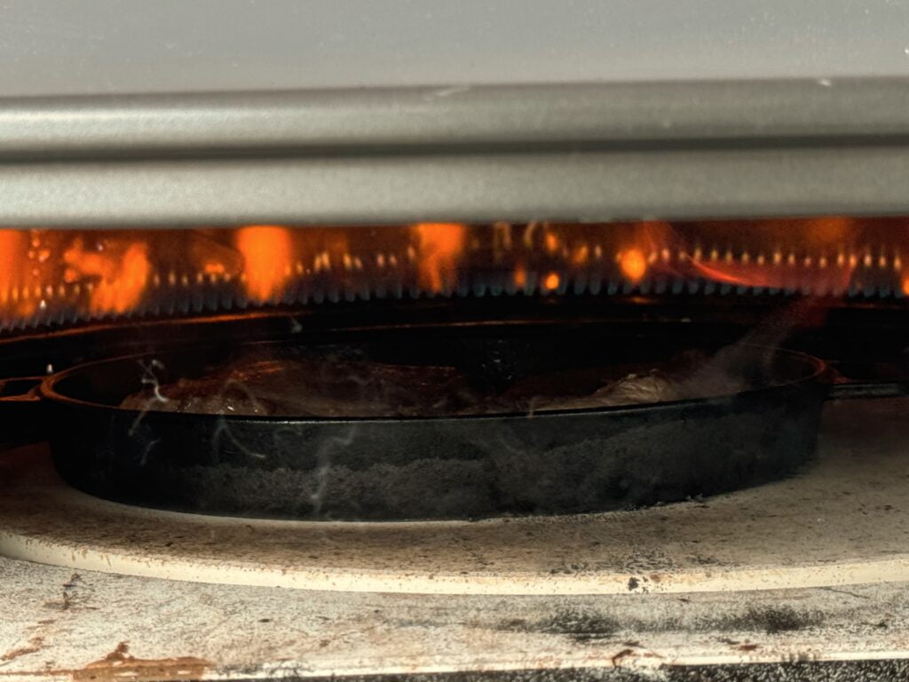 Stelle die leere Gusseisenpfanne* für etwa 10 Minuten in den heißen Ofen, um sie gründlich zu erhitzen. Nimm sie dann vorsichtig heraus und stelle sie auf eine hitzebeständige Oberfläche. - Schritt 3: Rib-Eye Steak im Pizzaofen zubereiten
