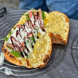 - Sandwich zusammenstellen: Teig öffnen, mit Rucola, Steakstreifen, Parmesan und Balsamico-Reduktion belegen. Mit Salz und Pfeffer würzen.