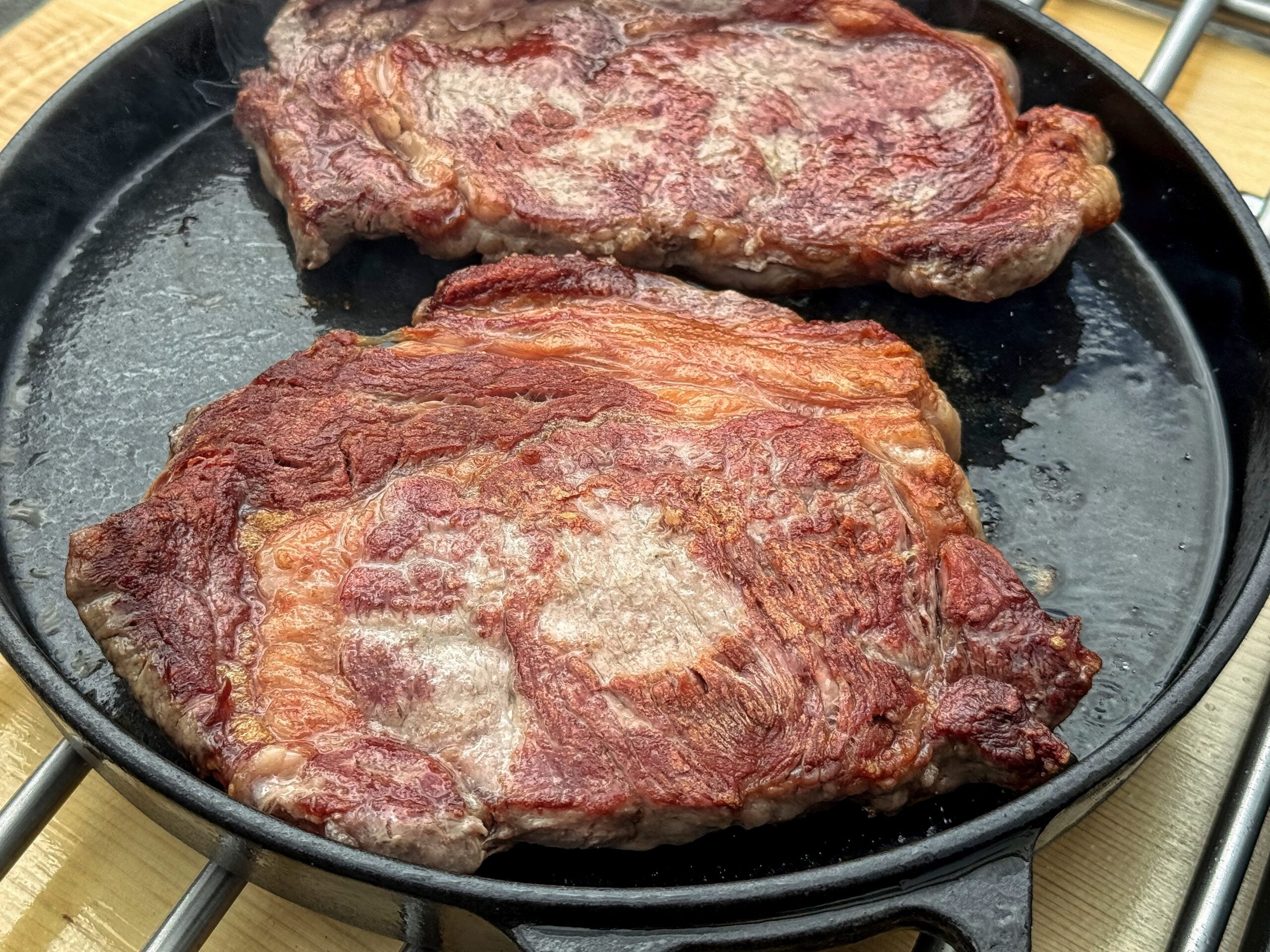 - Steak zubereiten: Rib-Eye in der heißen Pfanne 4-5 Minuten pro Seite garen, bis medium-rare erreicht ist. Steak ruhen lassen.